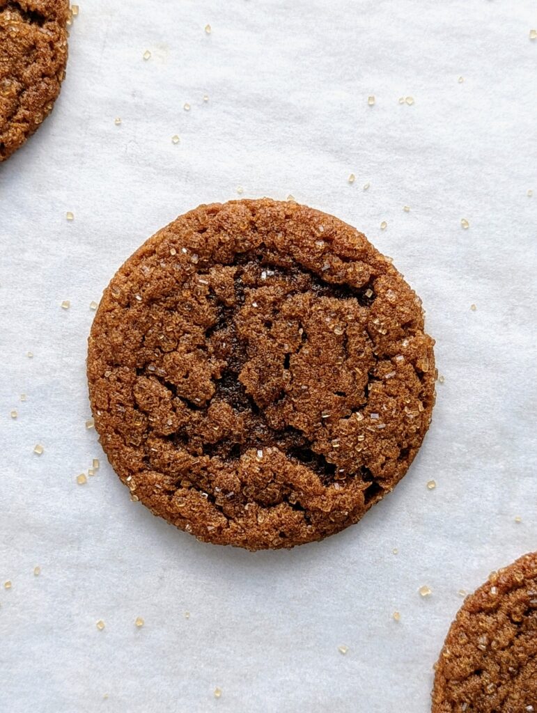 These cookies are softer than a gingersnap, but not quite as soft as these delicious molasses cookies from Sally’s Baking (another one of my favorites!). They fluff up during baking, then flatten as they cool. They have slightly brittle edges with a soft, dense, and chewy center. Instead of rolling them in regular cane sugar, I like to sprinkle the tops with turbinado sugar to add an element of crunch to the cookie.