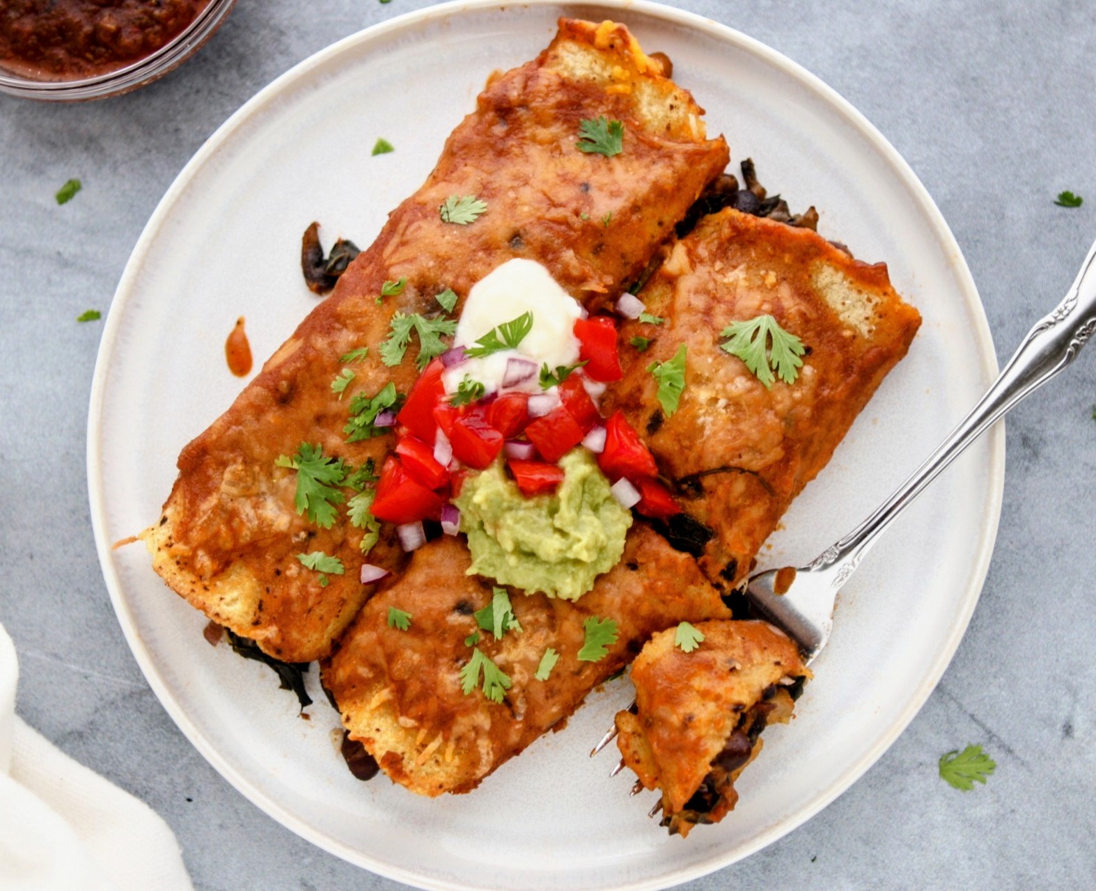 I’ve added chicken to the filling a few times to up the protein. Sautéed peppers and zucchini would also be a good addition for a little bit of crunch, and would be a good swap if you’re not into artichokes. Though I think the artichokes are partly what make the enchiladas so good. I’ve also made this recipe with sautéed mushrooms and kale. So versatile and every version has been delicious! The homemade sauce is the other reason they’re so good. It’s definitely worth the extra effort.